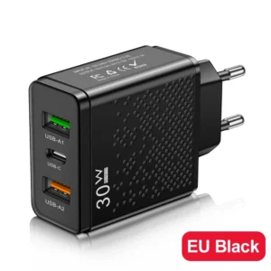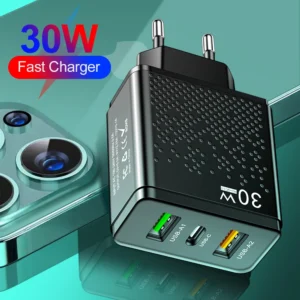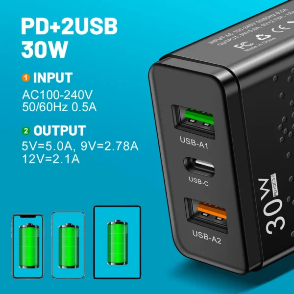 1. Three port charger: Equipped with 2 X USB+1 X PD30W Type-C ports to meet the simultaneous charging requirements of multiple devices.